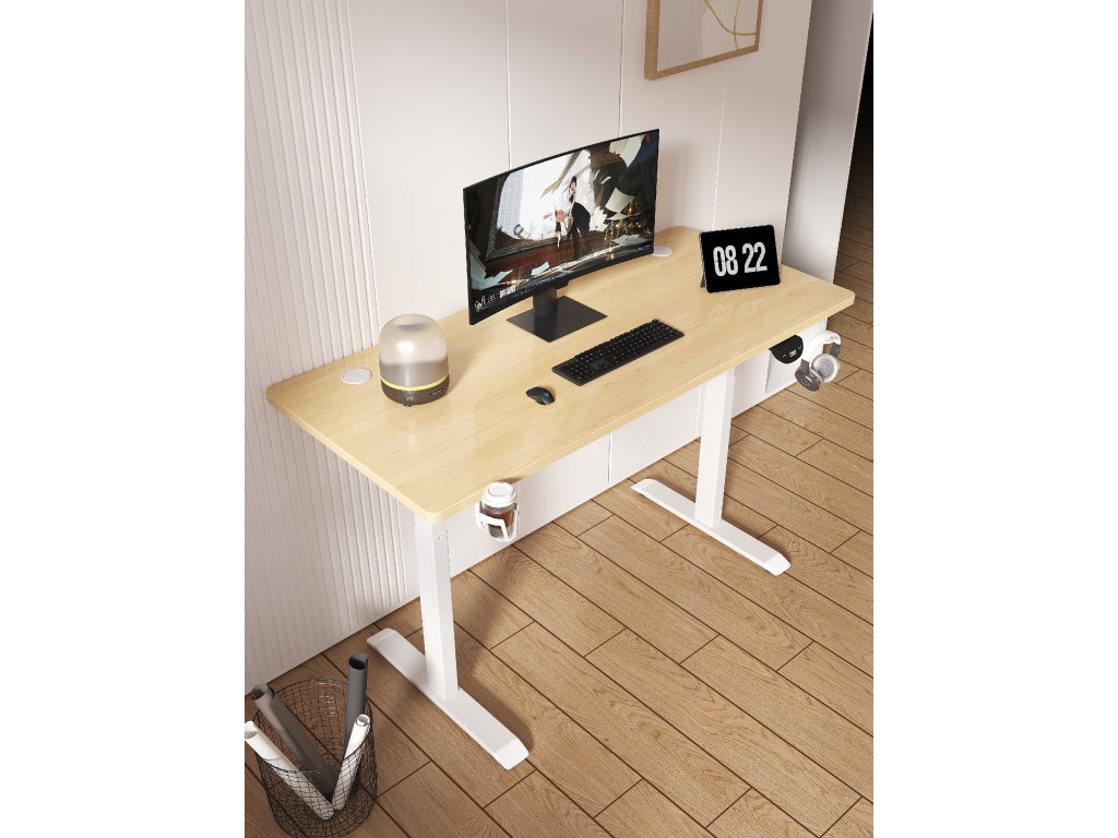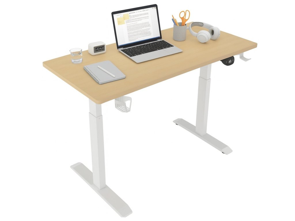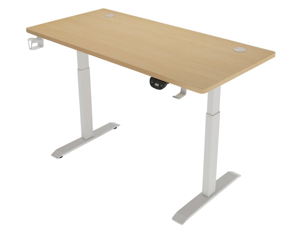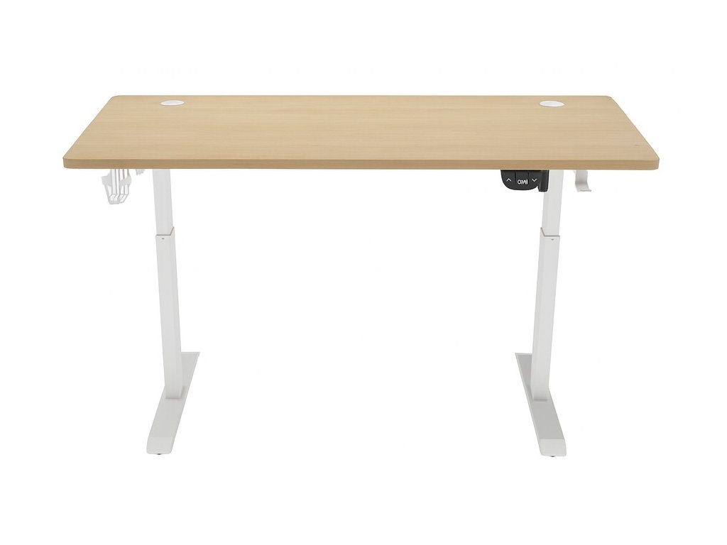 Elektricky nastavitelný stůl 140 cm – výška 72–118 cm, světle hnědý s bílým rámem, LED podsvícení