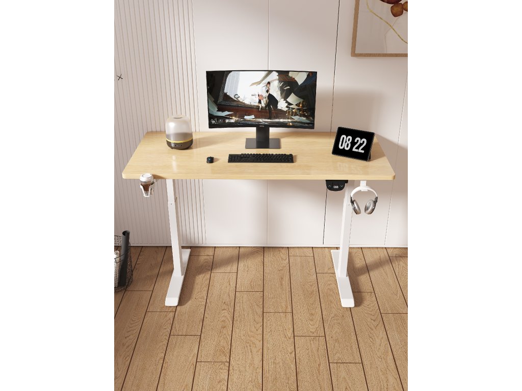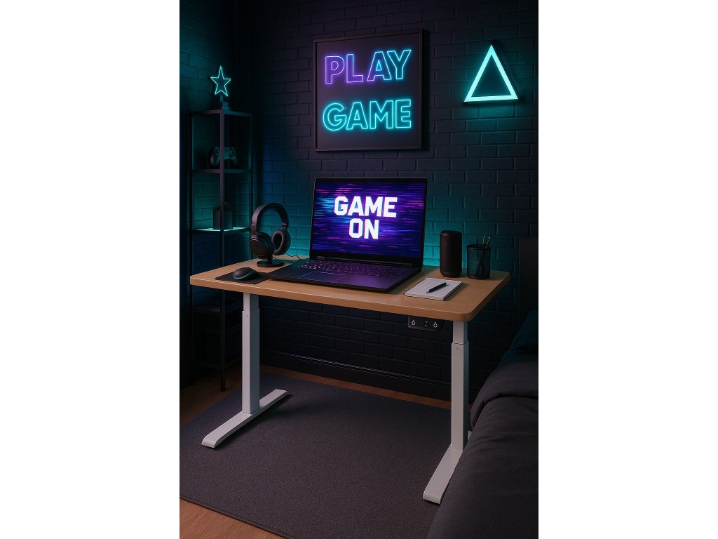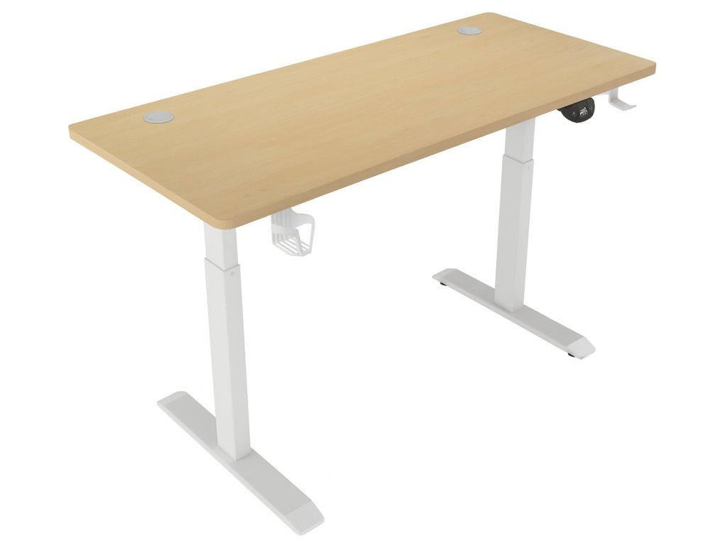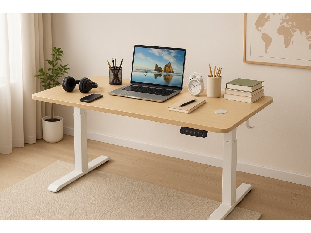 Elektricky nastavitelný stůl 140 cm – výška 72–118 cm, světle hnědý s bílým rámem, LED podsvícení