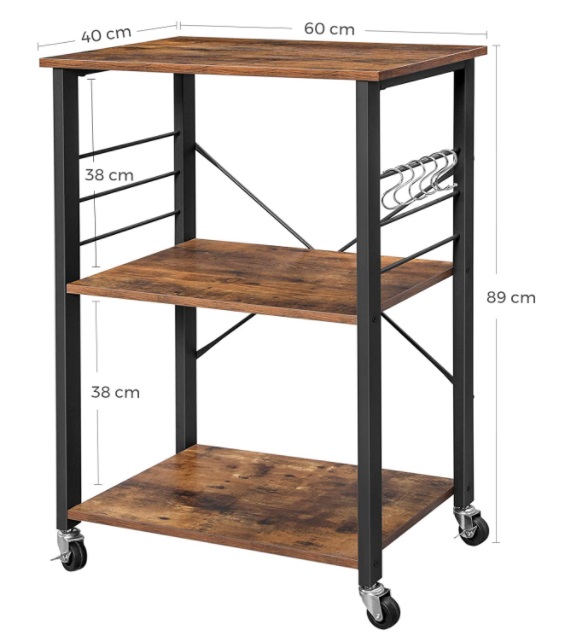 Stolek je vyroben v rustikálním stylu který je přiměřeně stylizovaný vzhledem na dobu. Police stolku jsou stabilní, takže na ně můžeme umístit elektrospotřebiče jako mikrovlnnou troubu, kávovar, nádobí, potraviny, koření a mnoho jiného.
